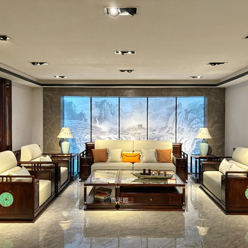 Цей елегантний новий диван із твердої деревини в китайському стилі ідеально підходить для великих віталень. Він ретельно виготовлений фабрикою секвої Chuantjiang із дорогоцінного чорного дерева чудової якості. Це підлогова модель, а загальна форма дає людям відчуття величі та розкоші. Широкий дизайн підлокітника не тільки красивий, але й практичний. Товста м’яка підкладка робить сидіння м’яким і комфортним, а сидячи на ньому, ви відчуваєте себе ніжно закутаним. Використання розкішного каменю є завершальним штрихом, який миттєво підсилює розкіш дивана та додає сліпучу та розкішну атмосферу вітальні.